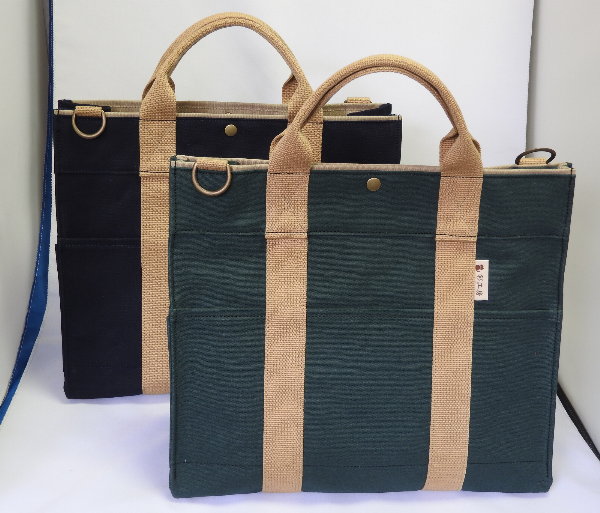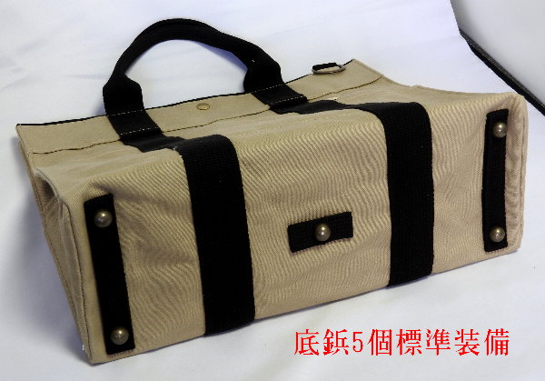 帆布という軽くて丈夫な自然素材が好きだったので、形状・色ともに希望のものが手に入り、たいへん満足しています。あと、床にバッグを直接置くことが多いので、底鋲が付いていて、しっかり自立してくれることも、とても満足できる点です。